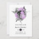 Watercolor floral gothic wedding save the date in accents of lavender purple, black and faux glitter silver designed to be quickly and easily customised to your event specifics.