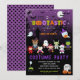 Invite your friends for some spooky fun with this black and purple bootastic Halloween costume party invitation. This design features a black and purple spooky house, sky and tree background with ghosts, bats, spiders and all your friends dressed in their best costumes.