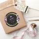 Make a lasting impression with this elegant floral design featuring a round gold frame with pretty purple flowers on a black background.
