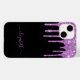 An elegant, girly and glam phone cases. Purple, lavender coloured coloured faux glitter drips. A chic black background. Personalise and add a name, written with a modern hand lettered style script with swashes. Violet coloured letters. To keep the swashes only delete the sample name, leave the spaces or emoji's in front and after the name.