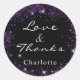 A classic black background. Decorated with purple faux glitter dust. Personalise and add your first name. With the text: Love & Thanks.