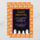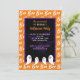 Personalise Hallow's eve invite with orange purple Halloween pattern. With orange and white text and purple accents.