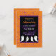 Personalise Hallow's eve invite with orange purple spider web Halloween pattern. With orange and white text and purple accents.