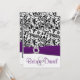 Black, Purple & White Damask Wedding Invitations - each damask wedding invitation features a printed wrap around purple ribbon with a diamond round buckle embellishment for an added feminine touch. Below the printed ribbon, the bottom half is crisp white. Above the ribbon on the top half of each invite showcases and elegant print of black and white damask. The design wraps around to the back and features the same design with an elegant text box shaded in a very light purple to allow the text pop out. The text box also allows the graphics to peek through for added flair. The paper type is set to linen invitation stock for a fancier invite; however, you can change the paper type to basic, felt or metallic under the orange customise button below the invite demo. Each invitation comes with a white envelope.