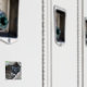 Adorable black and white bunny poking it's head out of the hollow of a tree.