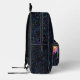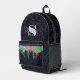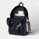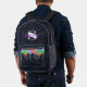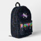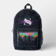 This custom printed backpack features a black liquorice rainbow glitter background, with rainbow tie-dye glitter dripping from the front zip pocket, The template allows for easy personalisation, including a large monogram initial and / or a full name in a neon violet purple calligraphy script font. Either can be easily eliminated by simply leaving the custom text box blank.