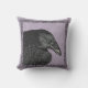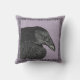 This decorative pillow in outdoor fabric has the head and shoulders of a black crow in an ornate black frame on a background of mixed purples with white accents.