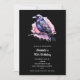 A birthday invitation with an image of a black crow with purple pink wings. A pink watercolor splatter behind this lovely mystical bird.