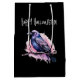 Gift bag with an image of a black crow with purple pink wings. A pink watercolor splatter behind this lovely mystical bird.