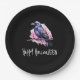 Paper plates with an image of a black crow with purple pink wings. A pink watercolor splatter behind this lovely mystical bird.