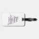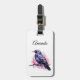 A luggage tag with an image of a black crow with purple pink wings. A pink watercolor splatter behind this lovely mystical bird.