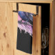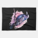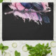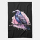A kitchen towel with an image of a black crow with purple pink wings. A pink watercolor splatter behind this lovely mystical bird.