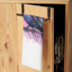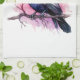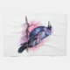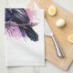 A kitchen towel with an image of a black crow with purple pink wings. A pink watercolor splatter behind this lovely mystical bird.