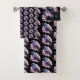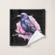 Towel set with a repeating image of a black crow with purple pink wings. A pink watercolor splatter behind this lovely mystical bird.