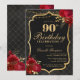 Celebrate in unforgettable style with this dramatic black and gold 90th birthday invitation. Featuring an elegant ornamental frame, rich red florals, and a luxe-inspired layout, this design is perfect for a sophisticated evening celebration.