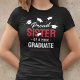 Beaming with pride of the success of your brother or sisters achievements! Then show them how proud you are with these black graduation celebration t-shirts featuring falling mortarboard caps, the text "proud sister of a 2025 graduate", the grads name, and the colour red to represent their school or college colours.