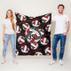 This sporty but girly volleyball fleece blanket features a large black, red and white artsy, stylised volleyball, upon which her name and jersey number can be personalised, overlying a pattern of smaller black, red and white volleyballs and the sporty font text "I love volleyball" that stretches between the angled rows of volleyballs - background is customisable black - by katz_d_zynes