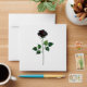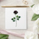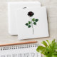 Symbolic, artistically drawn black rose with green stems and leaves on white background. Black rose.