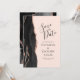 The left-hand edge of this elegant modern wedding save the date card features a black watercolor agate border trimmed with faux rose gold glitter. The customisable text combines slate black handwriting, copperplate and italic fonts on a blush pink background. The reverse side features a matching black and rose gold agate design.