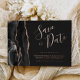 This elegant modern save the date card features a black watercolor agate border trimmed with faux rose gold glitter. The customisable text combines real rose gold foil handwriting script, copperplate and italic fonts on a dark background. The reverse side features a matching black and rose gold agate design.