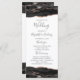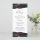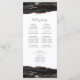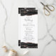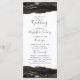 This elegant, modern wedding program features black watercolor agate top and bottom borders trimmed with rose gold faux glitter. The text appears in elegant charcoal grey handwriting and copperplate fonts on a white background.