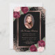 Elegant black and rose gold floral photo in loving memory/memorial service/celebration of life/funeral invitation featuring a rose gold frame adorned with pink and burgundy roses and rose gold glitter.