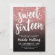 Sweet Sixteen Birthday Party Invitation. Celebrate sixteen in style with this modern and festive design. The front features a faux rose gold glitter background that fades into a sleek black gradient at the bottom, with the words “Sweet Sixteen” beautifully highlighted across the top in elegant script. A mix of script and clean modern fonts in crisp white creates a striking contrast that feels both chic and timeless. The back features a solid black background for a simple, polished finish. Perfect for celebrating 16 years old, this invitation can be customised with your choice of font and background colours to fit any party theme.