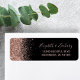 The left-hand edge of this elegant modern wedding return address label features a rose gold faux glitter design. The customisable text combines pale rose coloured handwriting, copperplate and italic fonts on a black background.