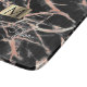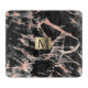 Personalise your names in white script and black monogram on gold box over black and rose gold marble.