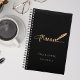 A chic black background, decorated with a feather pen. Personalise and add a name and year. Golden text: Planner
