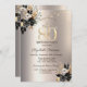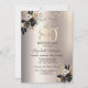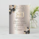 A modern, chic and glamourous invitation with an elegant gold tiara, black roses, and string lights on a ivory background.
