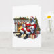 Digital illustration of Black Santa sitting in front of a fireplace with a tree, gifts, and stockings. Text can be customised or removed, including message and address of your business inside. AI assisted graphic purchased with commercial use. Artwork: DreamCafeArt