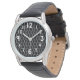 This men's watch has an art deco design of white half circles connect with lines on a field of black.