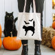 Black Scared Cat Silhouette With Bats Halloween Tote Bag