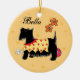 Show your dog love with this unique ornament with a cute black terrier dog and personalised with your dog's name or other words. Personalise with your dog's birth year on the back side or change to his or her name. Great for a gift or for your Christmas tree. This whimsical black Scottie Terrier is wearing a yellow sweater coat decorated with a red collar and red paw prints. An red ball with turquoise blue dots is behind the Scottie. The background is yellow with tonal yellow paw prints to make a stylish, trendy and decorative ornament. Two orange flowers are above the dog. This cute, cuddly and trendy dog is original art by Phyllis Dobbs and will melt the heart of a dog lover. This Scottie is one of a series of 6 Scotties and all are fully customisable to make it your own!