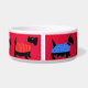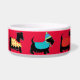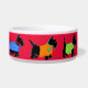 Customise this dog pet food dish to show your love of Scottish Terrier dogs and personalise with your dog's name in the centre on a red background. The colourful design has 6 black Scottie dogs in a colourful array of dog clothes and on a red background. These whimsy, cute and adorable Scotties are wearing various colourful dog sweater coats or tees and one has a toboggan hat. The colours are red, lavender, purple, yellow, turquoise teal blue, lime green and orange with paw prints, stars, stripes, checks, and snowflake patterns. These whimsical and trendy dogs are original art by Phyllis Dobbs and will melt the heart of a dog lover. These pet Scotties are both individually and on colourful blocks with borders for coordinating products. All are fully customisable to make it your own!