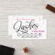 Stylish loyalty punch card for a lash artist in an eye catching design with a lash pattern in gold and white, black swirly script, and bold magenta as the accent colour. For a discount on the sixth visit, with a hot pink heart as a marker.