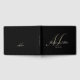 Elegant black and white monogram with bride and groom names and date wedding guest book. Black with white and grey script and plain italic text. Front - bride and groom names in white script overlay a large grey script monogram, wedding date below in white plain italic text. Small monogram on back. Spine with bride and groom and book title in plain italic text.
