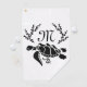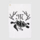 Sea turtle swimming in a tribal silhouette style. While the original was a based of an green tortoise, the shape of the segments bagging to be twisted and turned. Above the shell to the left and right is black seaweed leaving space for text, default is a letter "M" m is short for monogram. And below the turtle are water swirls.