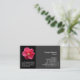 A business or profile card template with a band on the left, with a single flower motif, decorated with vertical text captions labelling the address area and contact details. The reverse of the card has the same colour theme as the front but has been left blank which can be left as is, or further customised. Suitable for a variety of businesses.