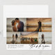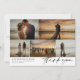 Say thank you to your wedding guests with a photo collage card where you can feature five of your own lovely wedding photos in a clean asymmetrical collage. Add your names and wedding date in a modern black font. Thank you is written in a vintage style signature script. On the back you can write by hand a personal thank you message on the faintly lined background. The perfect photo collage wedding thank you card to show off your favourite photos of the best day of your lives with your names in a modern font combined with a retro script saying thank you.
