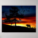 Black Silhouette of Wolf, Birds and Tree in Sunset Poster