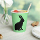 These paper cups have the side profile of a black silhouette sitting bunny rabbit with tall ears on a green background.
