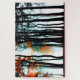 Black silhouettes of a forest of trees, their leaves changing colour in a glorious display of autumnal beauty. The trees are depicted against a white background, which makes the colours of the leaves pop. The branches of the tree are delicate and intricate.
