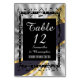 Traditional chic elegant modern sleek masculine black, silver grey and gold personalised table number with musical notes surround, on black background and swirly ribbon , personalise with your text to the templates for your special occasions or celebrations. Visit the PERSONALIZED _WEDDINGS STORE for matching products. PLEASE NOTE THE golden colour, and silver pewter colour is not metallic.