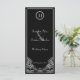 An elegant, vintage style wedding reception menu with a 1920's "The Great Gatsby" theme in Black and Silver Grey tones. A black background highlights the intricate geometric, Art Deco style border in silver tones. The Bride and Groom's monograms are highlighted within a double border circle.