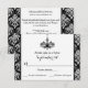 This elegant formal ballroom chandelier black and white with silver grey damask pattern rsvp card has a Baroque Victorian in FAUX silver damask border on it that matches the 25th wedding anniversary invitation shown below. All the text is customisable, and so are the paper choices. ****PLEASE NOTE that the metallic silver paper is a very dark charcoal grey and it will alter the colours of the design severely, so I do NOT suggest using that paper. It is shown here on basic paper, but it would sparkle extra nicely on metallic ice paper, which has a subtle opalescent sheen to it. The felt paper is a nice thick, textured paper that would also give luxurious results. Linen will cool the design down and is a light-weight paper with thin lines running across it. Delicate paper is VERY thin and semi-transparent like vellum, so I don't suggest ordering that or the grooved paper. ALSO, if you change fonts or font sizes, your text may not fit properly any more. Zazzle will not edit anything for typos, alignment, or anything else, and I will not see your invitation. Everything will print as it appears on your monitor. If you need help with the invitation, please contact me BEFORE you order it. This rsvp card is designed to fit the 3.5x5 size card, so if you change to another size, the design will no longer fit properly. If you want a different size, please contact me so I can re-design it for you BEFORE you order. If you require any other matching items in this design, please email your request to niteowlstudio@gmail.com.