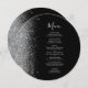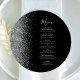The left-hand edge of this elegant modern wedding menu features a silver faux glitter border. The customisable text combines silver grey whimsical handwriting script and copperplate fonts on a black background. The reverse side features a matching black and silver glitter design.