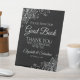 This beautiful wedding tabletop guest book sign is a wonderful welcome for your guests, and will help you direct them to sign your guest book to leave a lasting memory of your special day. It features a simple yet elegant black and silver design with script lettering and lacy faux foil curls and swirls in the corners. The sign reads: Please Sign Our Guestbook Thank You for Celebrating with us! There is room for your names and the wedding date below.