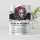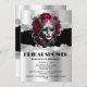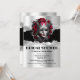 The face of a beautiful woman with silver grey skin and dark red ruby red lips is wearing an ornate, decorative faux silver eye mask that has large satin roses and plumes on it. She is set against a faux shiny silver and black background with editable black templates. This elegant, luxurious, trendy and glam design is ideal for a bachelorette, birthday, sweet sixteen or quinceanera party. Simply personalise the editable text templates to suit your special occasion.
